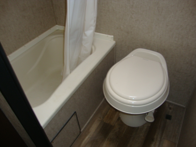 Bathroom is oversized and has a large shower. Porcelain toilet and vanity with plenty of storage spaces. Master bed room has a walk-around queen bed, plus wardrobes. Outside is a 20ft electric patio awning, power tongue jack, stabilizer jacks and oversized pass through. Light weight retractable steps.